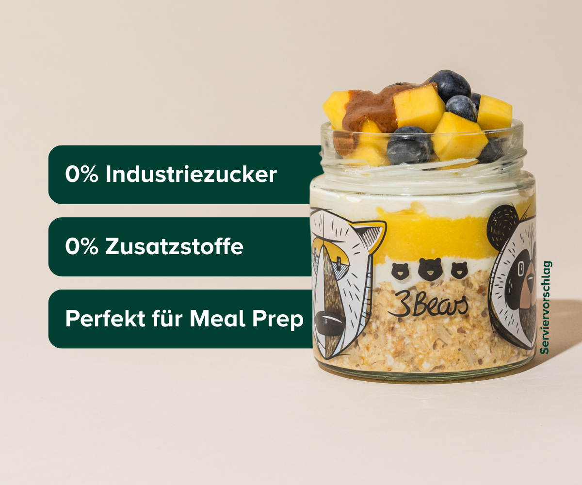 Unser Overnight Oats Glas ist eine echte Arbeitserleichterung: Die Markierungen auf dem Glas zeigen dir, wie du 50 g Porridge-Mischung, 100 ml Flüssigkeit und Toppings perfekt dosierst – ohne wiegen, ohne abmessen. Die Overnight Oats wandern direkt im Glas für mindestens 6 Stunden in den Kühlschrank. Porridge verputzt? Das Glas ist easy zu reinigen – in der Spülmaschine oder per Hand.Tipps zur Pflege