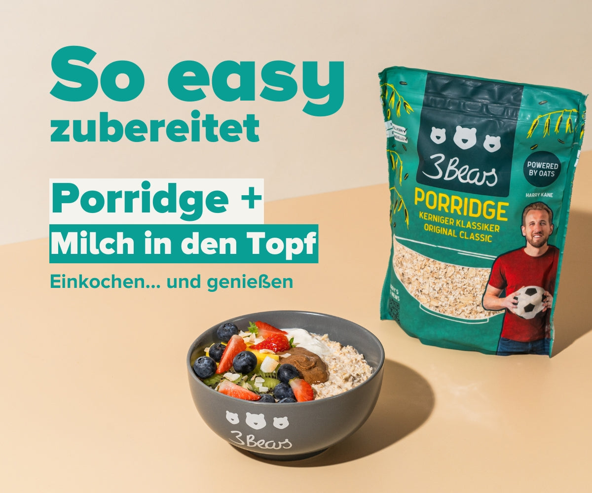 Wir sind Caro und Tim, ein deutsch-britisches Paar, und haben 2016 3Bears gegründet. Warum? Weil wir zum Einen einfach richtig große Hafer-Fans sind und begeistert sind wie viel Gutes in Vollkorn-Hafer steckt. Zum Anderen wollten wir Hafer-Produkte machen, die dein Leben einfacher machen. Dir tolles Frühstück bieten, das unglaublich lecker und abwechslungsreich ist – dabei easy in der Zubereitung und so natürlich wie nur möglich. Wir verzichten komplett auf Industriezucker und Aromen, packen getrocknete Früchte in unsere Mischungen und überlegen uns immer wieder in unserer Experimentier-Küche neueste Sorten. Alles bei uns ist 100% pflanzlich und 100% lecker. Probier's aus und werde Teil unserer Community. Join the Morning Oats Club!