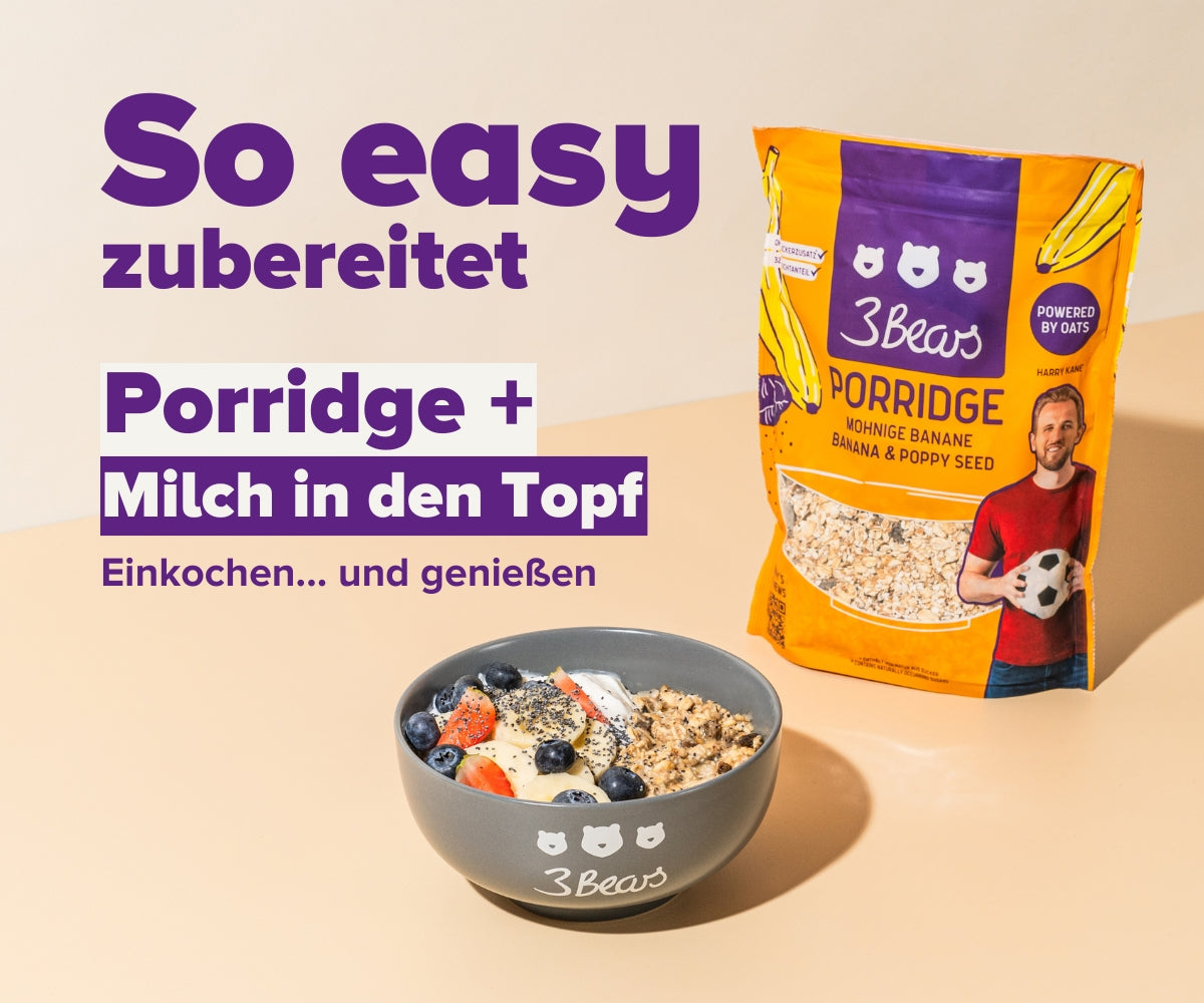 Wir sind Caro und Tim, ein deutsch-britisches Paar, und haben 2016 3Bears gegründet. Warum? Weil wir zum Einen einfach richtig große Hafer-Fans sind und begeistert sind wie viel Gutes in Vollkorn-Hafer steckt. Zum Anderen wollten wir Hafer-Produkte machen, die dein Leben einfacher machen. Dir tolles Frühstück bieten, das unglaublich lecker und abwechslungsreich ist – dabei easy in der Zubereitung und so natürlich wie nur möglich. Wir verzichten komplett auf Industriezucker und Aromen, packen getrocknete Früchte in unsere Mischungen und überlegen uns immer wieder in unserer Experimentier-Küche neueste Sorten. Alles bei uns ist 100% pflanzlich und 100% lecker. Probier's aus und werde Teil unserer Community. Join the Morning Oats Club!