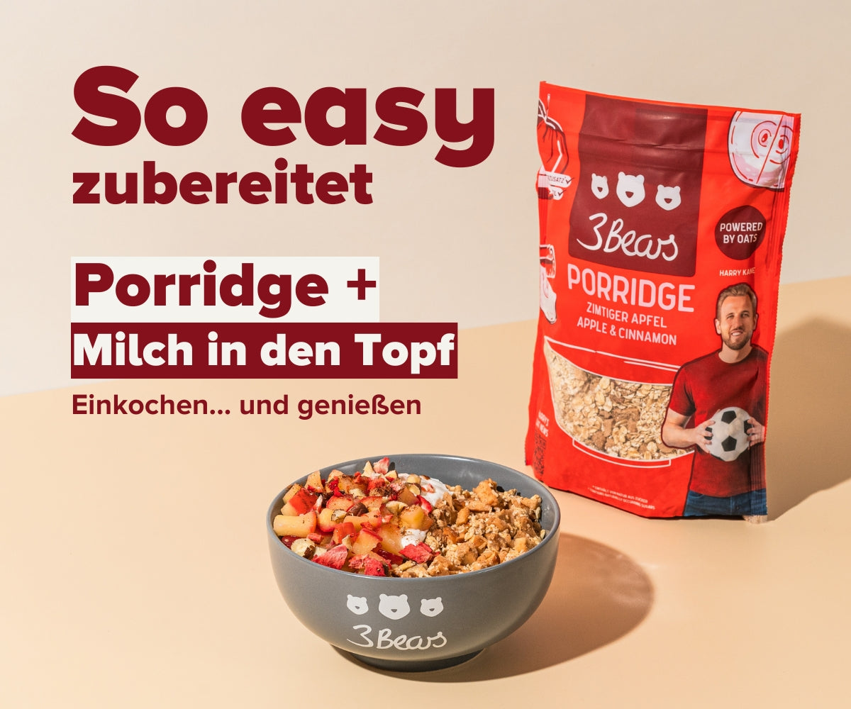 Wir sind Caro und Tim, ein deutsch-britisches Paar, und haben 2016 3Bears gegründet. Warum? Weil wir zum Einen einfach richtig große Hafer-Fans sind und begeistert sind wie viel Gutes in Vollkorn-Hafer steckt. Zum Anderen wollten wir Hafer-Produkte machen, die dein Leben einfacher machen. Dir tolles Frühstück bieten, das unglaublich lecker und abwechslungsreich ist – dabei easy in der Zubereitung und so natürlich wie nur möglich. Wir verzichten komplett auf Industriezucker und Aromen, packen getrocknete Früchte in unsere Mischungen und überlegen uns immer wieder in unserer Experimentier-Küche neueste Sorten. Alles bei uns ist 100% pflanzlich und 100% lecker. Probier's aus und werde Teil unserer Community. Join the Morning Oats Club!