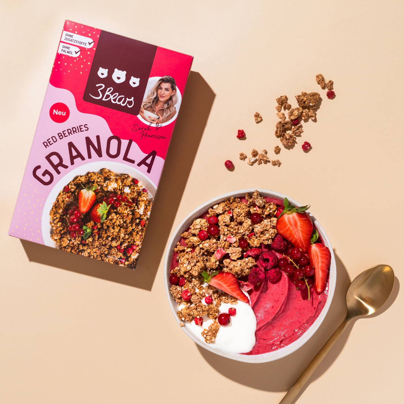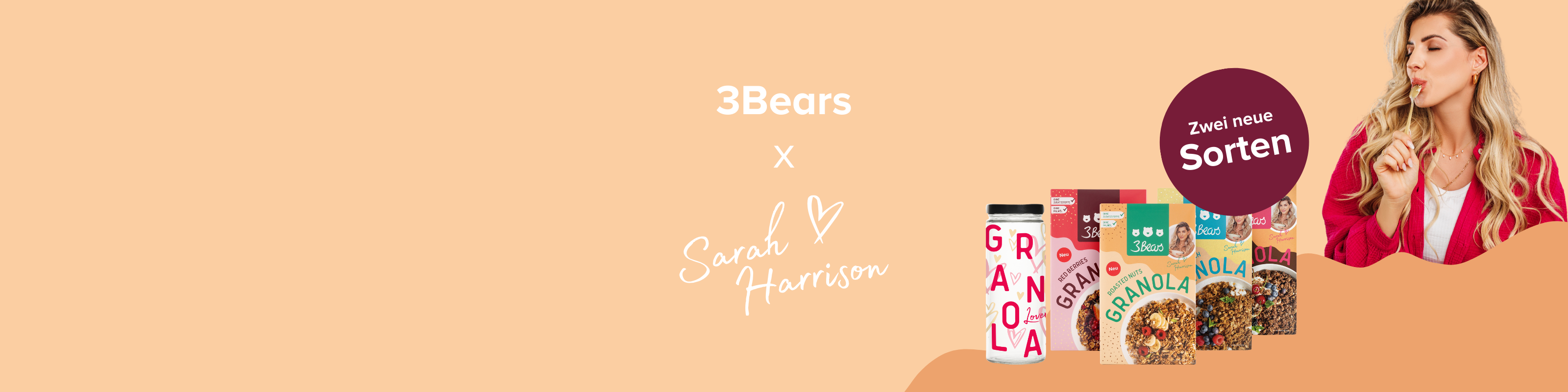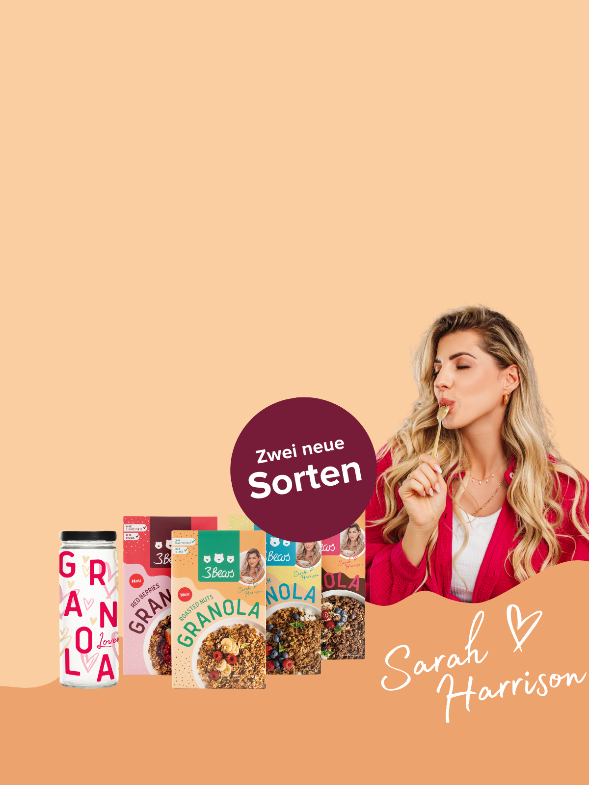 This is what influencer Sarah Harrison says about the granola she created with 3Bears: “I was looking for a super tasty, crunchy granola without processed sugar for ages. Unfortunately, it's really hard to find something like that. That's why I'm particularly proud that I developed two such fantastic varieties together with 3Bears! You will see that my granola tastes like it was homemade and is wonderfully varied. Try it with yoghurt and fresh fruit or just straight from the pack!”