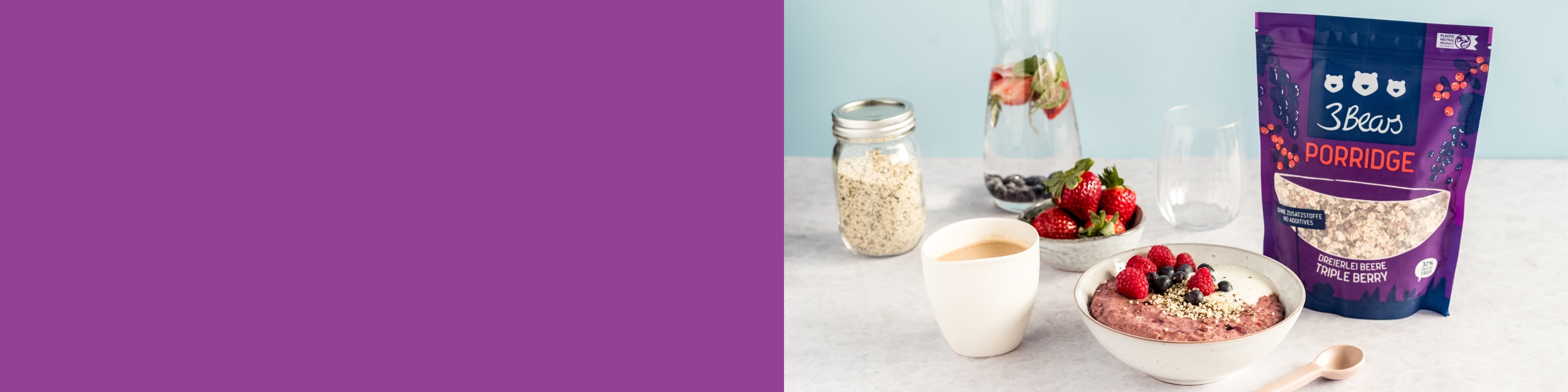 In 2016, we founded 3Bears with the motivation to bring delicious porridge products to market. We were disappointed that all the industrial products from the supermarket always contained so much sugar. From the beginning and up until today, principles such as transparency and naturalness have been at the top of our list. That's why we develop the porridge varieties in our own kitchen, sweeten them only with dried fruit, produce them in Germany and regularly visit the mill from which we get our oat flakes in person. At 3Bears, the customer does not pay for a "marketing scam", but quality Made in Germany.