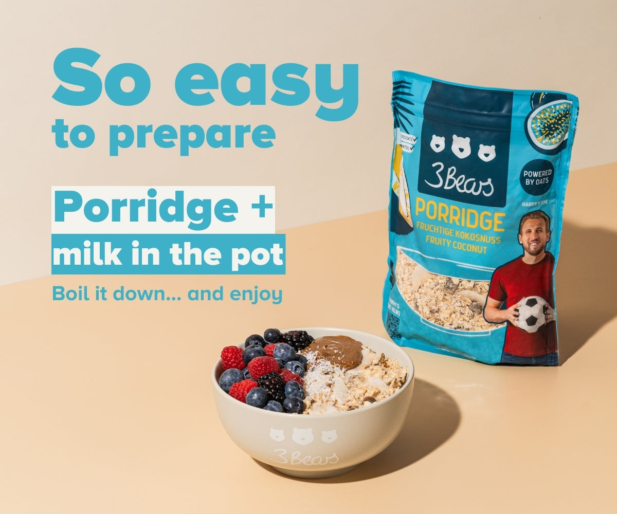 We founded 3Bears in 2016 because we were frustrated with how much sugar was in so many foods. We brought porridge to Germany because we think it's the perfect basis for a wholesome breakfast. You can now get pretty much everything to do with oats from us: overnight oats, bars, granola and accessories. And you can trust us to always stick to our principles. Our products contain no industrial sugar, no additives, they are always 100% plant-based and sustainability is deeply rooted in us.